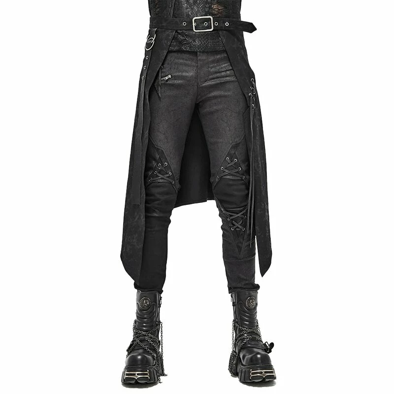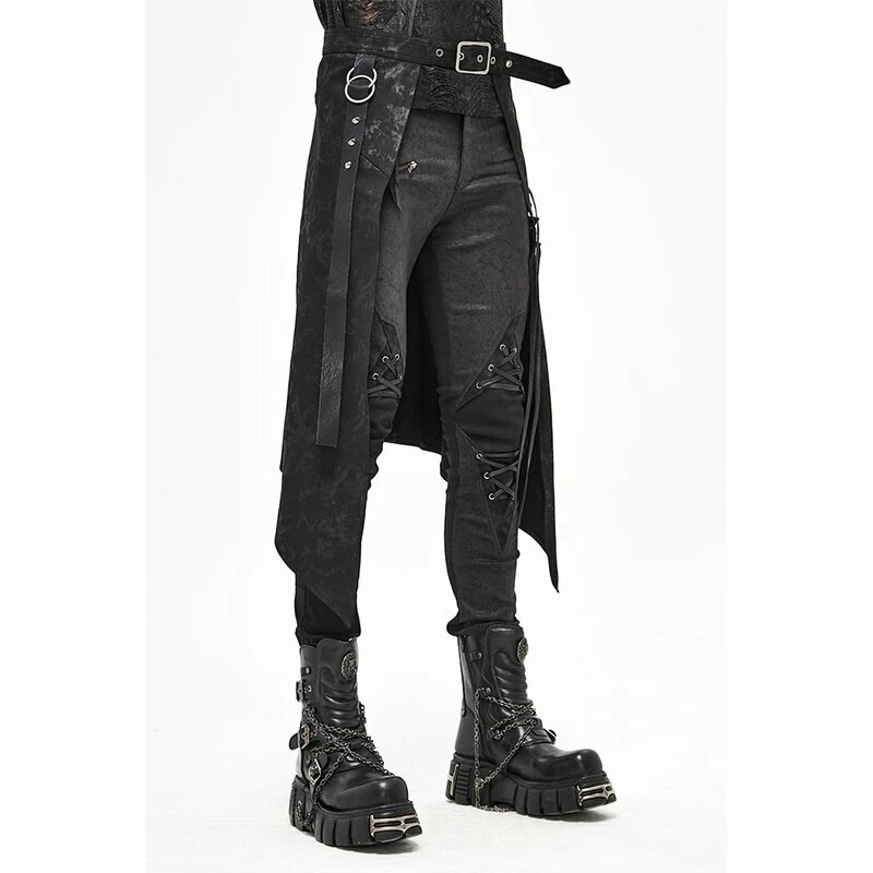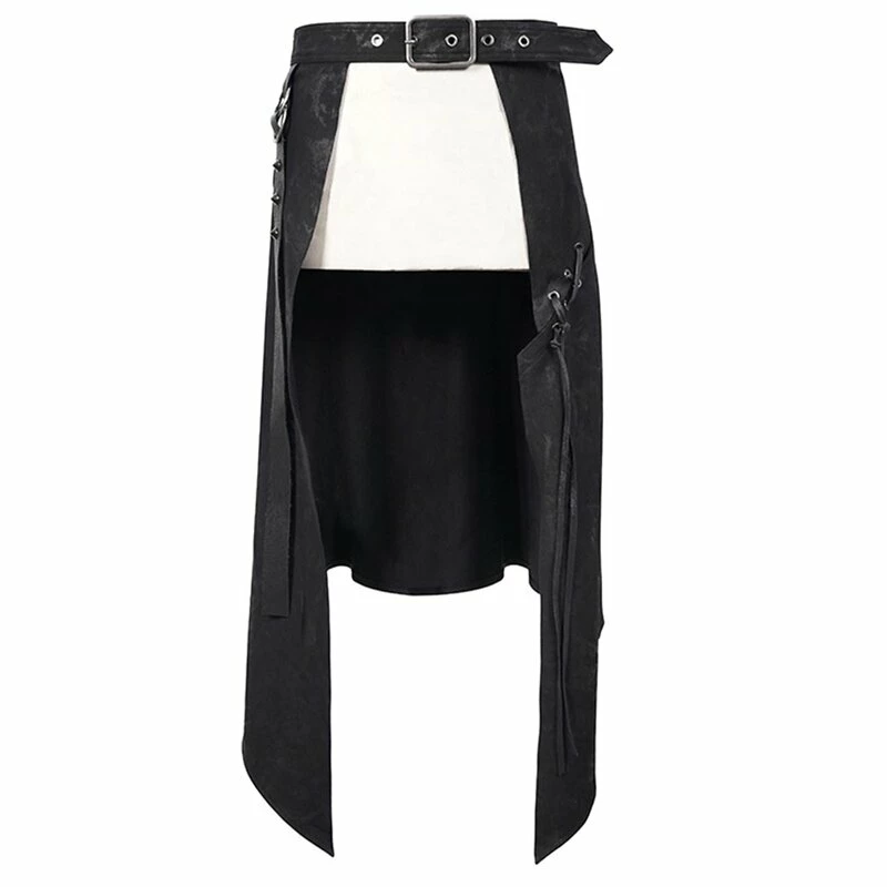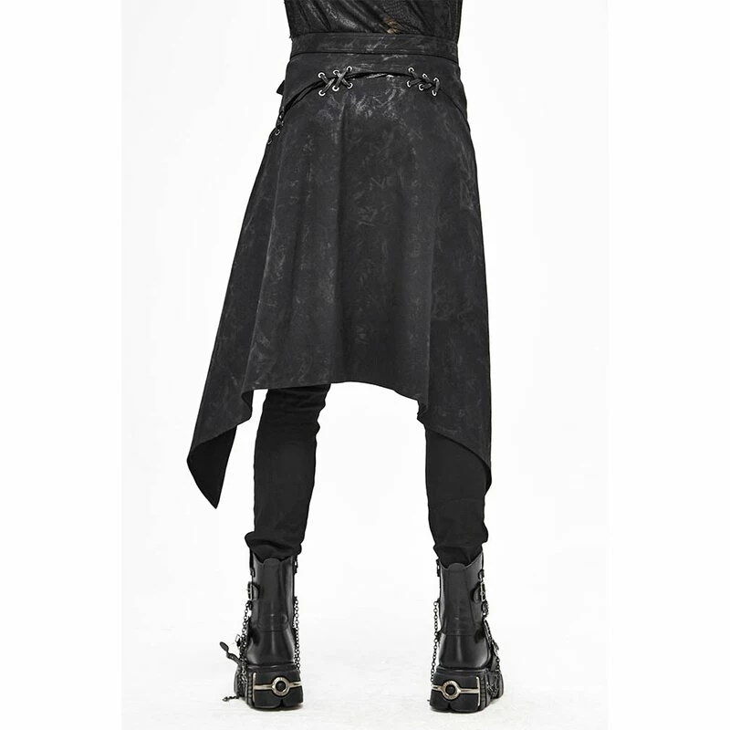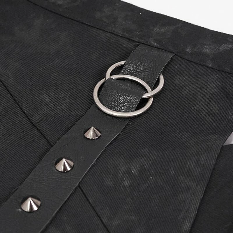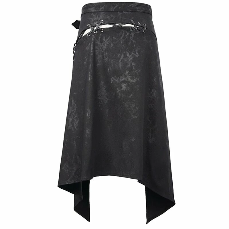 Offener Kilt von Devil Fashion. Der Vidar Kilt hat eine schwarze Grunge Waschung, eine Querschnürung und einen dekorativen Riemen mit Ringen und Spikes.