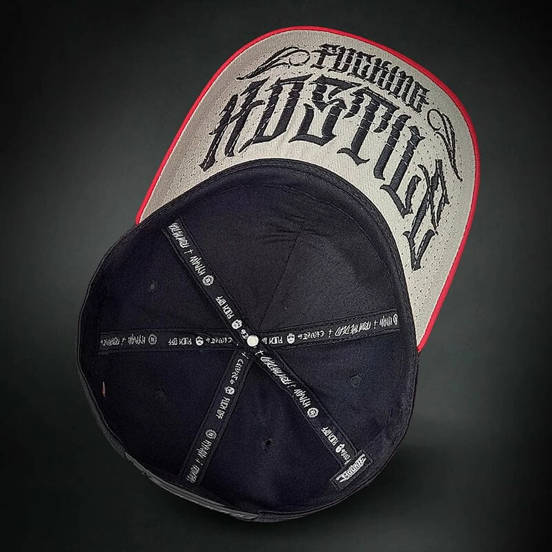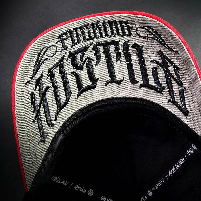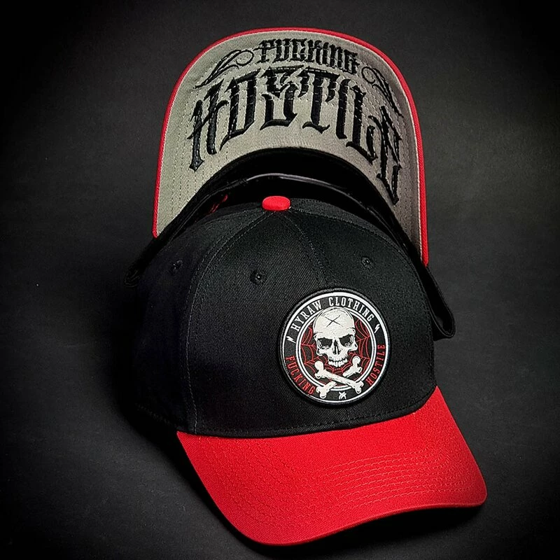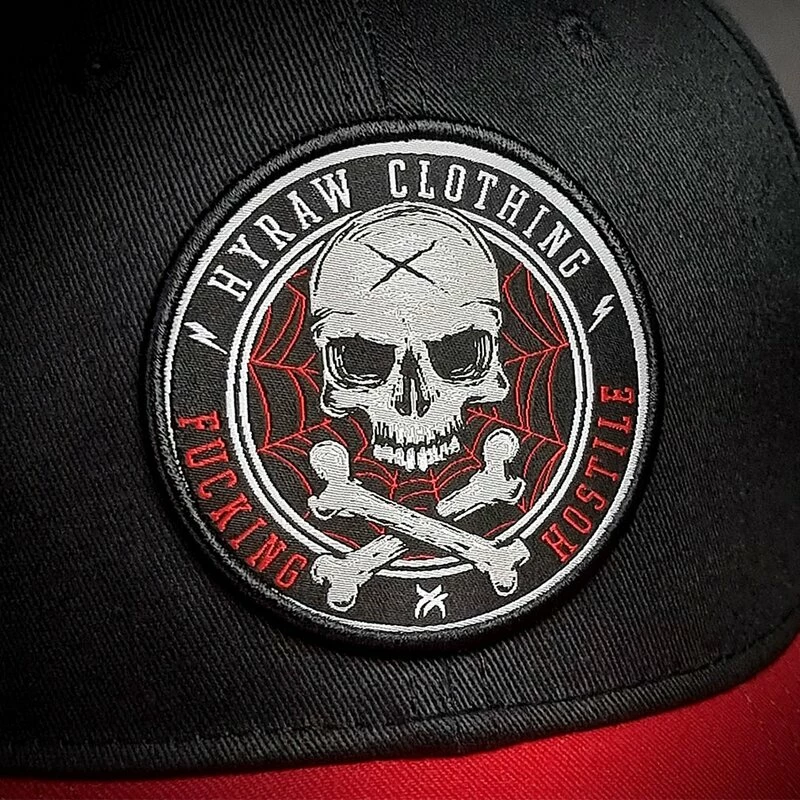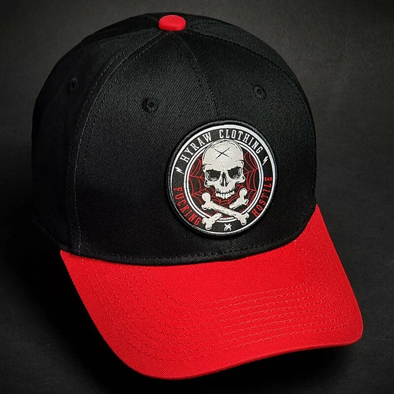 Coole Baseball Kappe mit gekrümmten Schirm von Hyraw. Die Red Flag Cap hat einen Patch mit Schädelwappen an der Vorderseite. Der Schirm ist an der Oberseite rot und hat an der Unterseite einen bestickte Schriftzug.