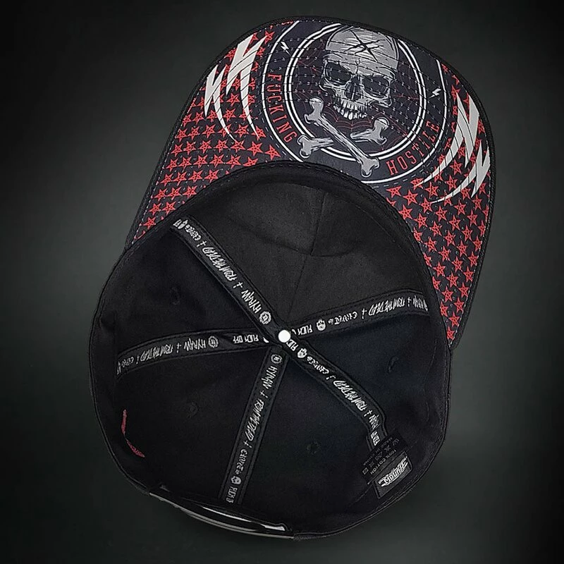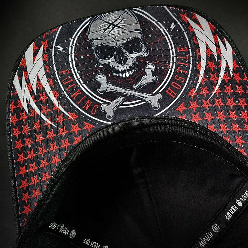 Coole Baseball Kappe mit gekrümmten Schirm von Hyraw. Die Stunt Cap hat einen bestickten Hyraw Schriftzug an der Vorderseite. An der Unterseite des Schirms befindet sich ein Schädel Print.