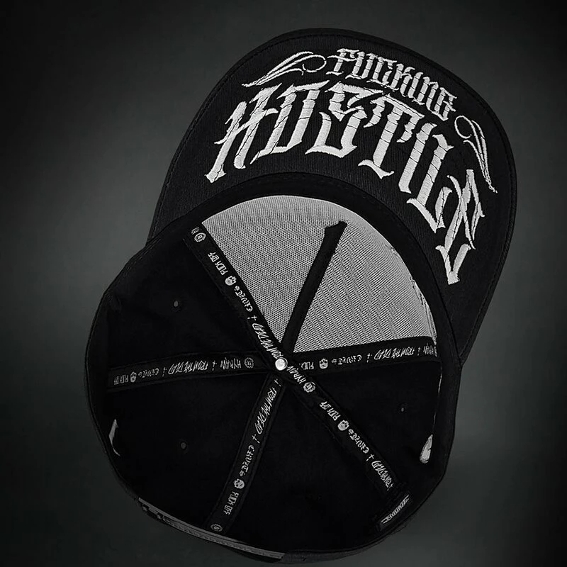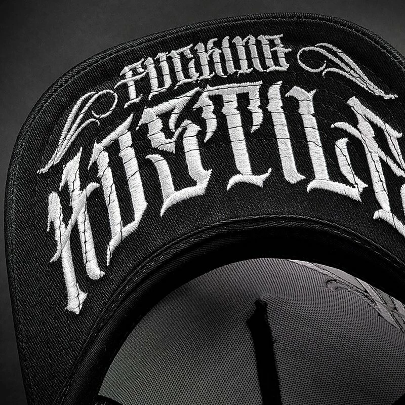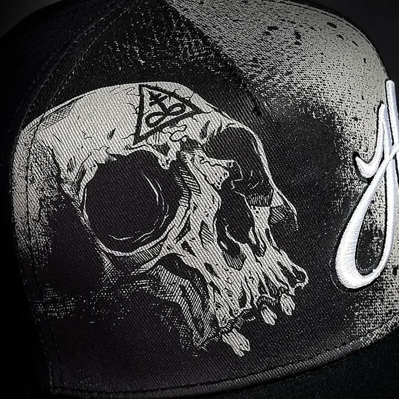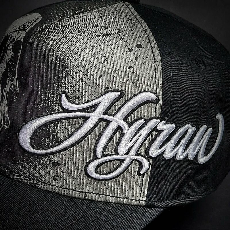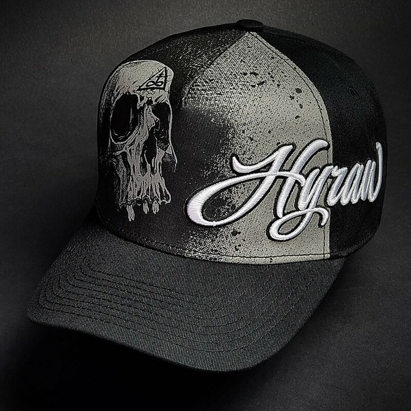 Coole Baseball Kappe mit gekrümmten Schirm von Hyraw. Die Vanity Cap hat einen bestickten Hyraw Schriftzug und einen Schädel Print an der Vorderseite. An der Unterseite des Schirms befindet sich ein bestickter “Fucking Hostile” Schriftzug.
