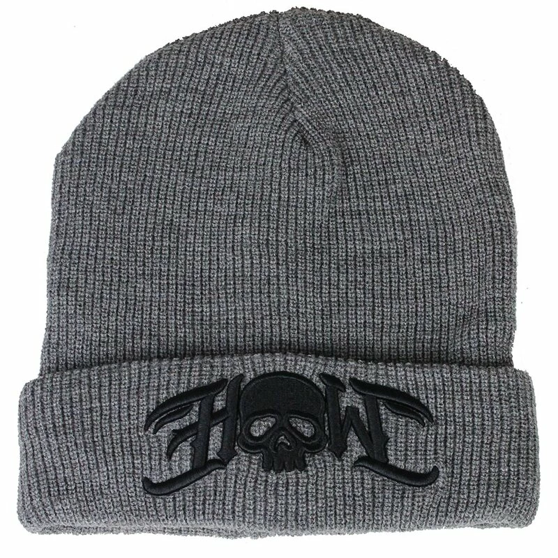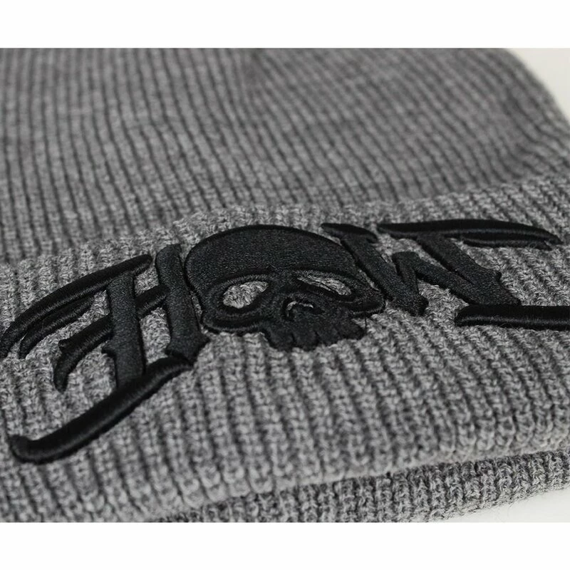 Graue Wintermütze von Hyraw. Der Grayskull Beanie hat eine Schädel Stickerei an der Vorderseite.