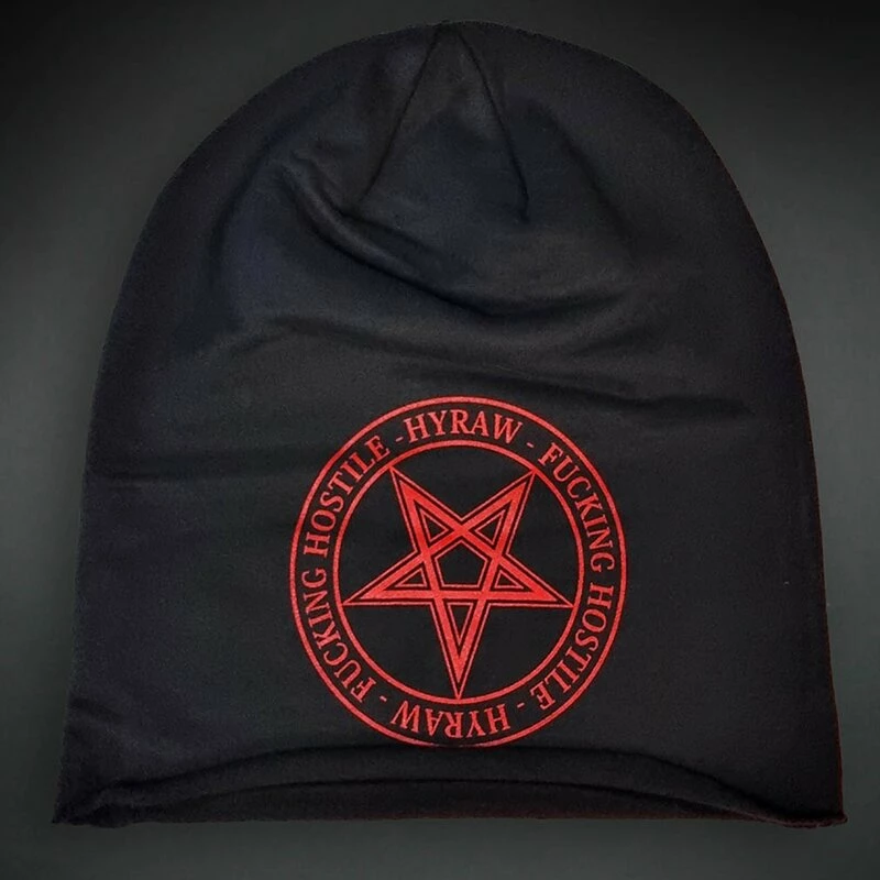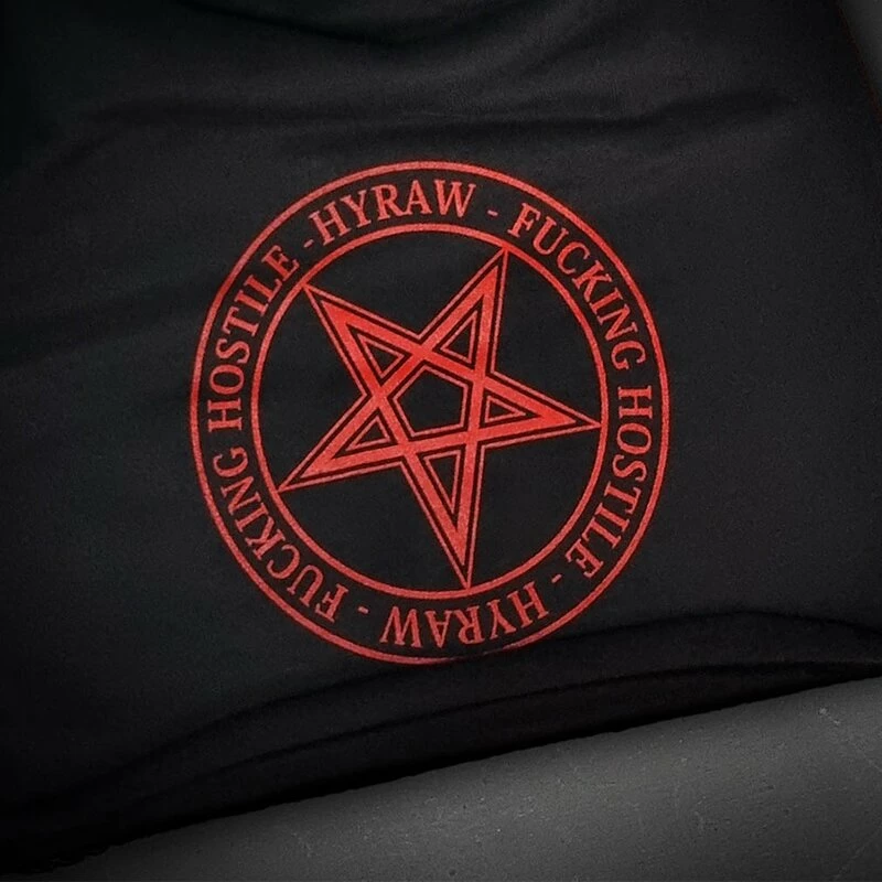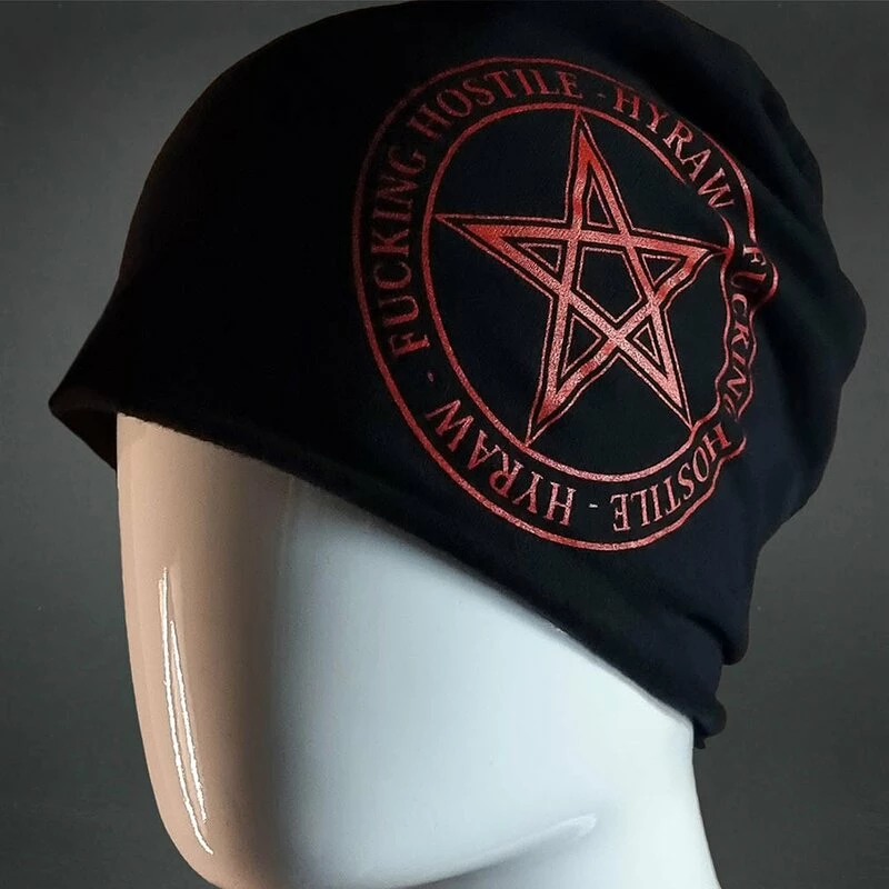 Punkiger Beanie von Hyraw. Der Pentagram Beanie hat einen Print eines roten Pentagramms, welches von “Hyraw: Fucking Hostile” Schriftzügen umkreist wird.