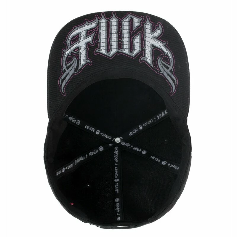 Coole Snapback Kappe von Hyraw. Die Fuck Cap hat eine Hyraw Stickerei an der Vorderseite, und einen “Fuck” Print auf der Unterseite des Schirms.
