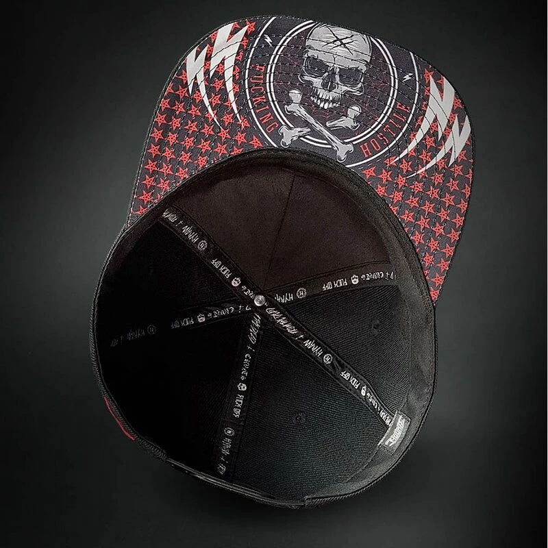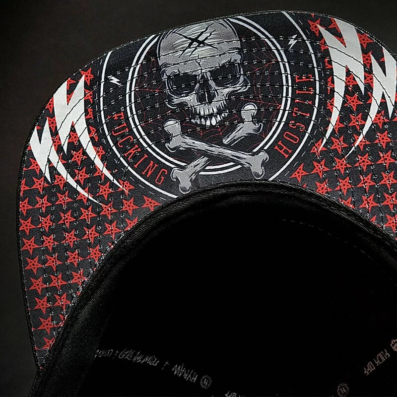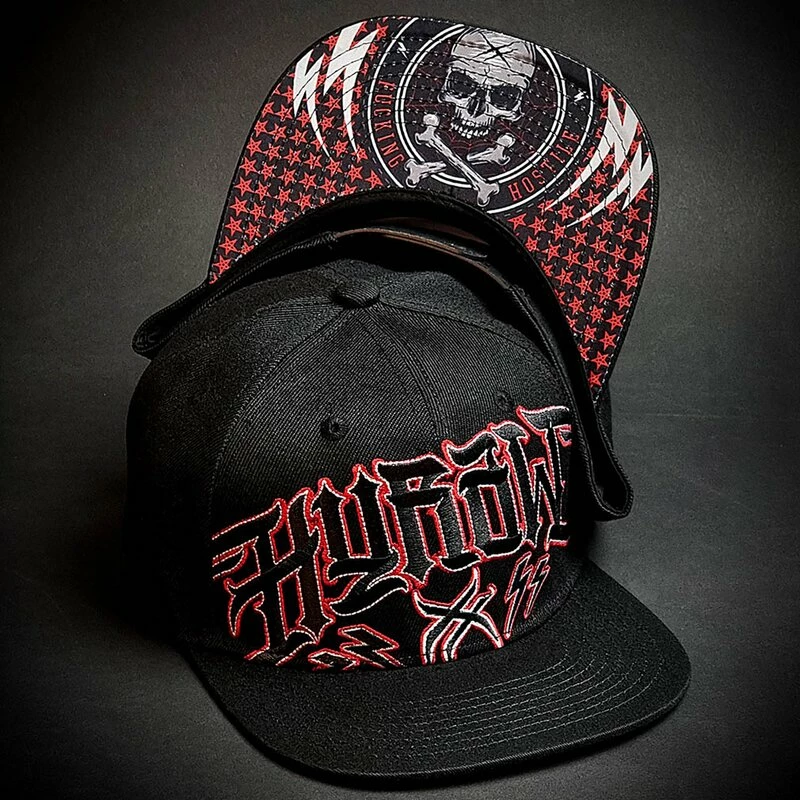 Coole Snapback Kappe von Hyraw. Die Stunt Cap hat einen bestickten Hyraw Schriftzug an der Vorderseite. An der Unterseite des Schirms befindet sich ein Schädel Print.