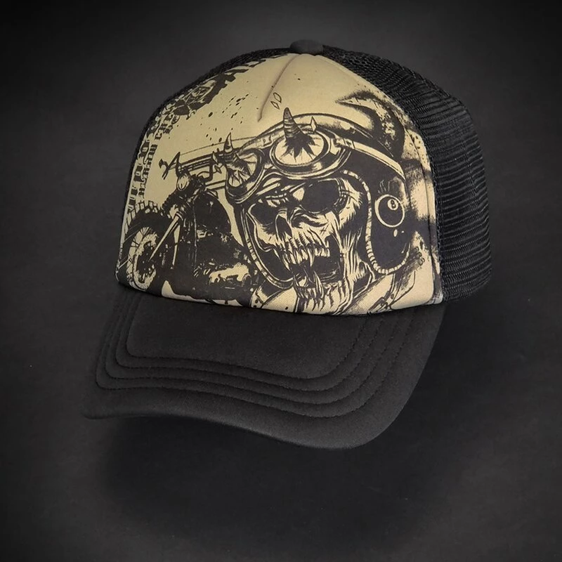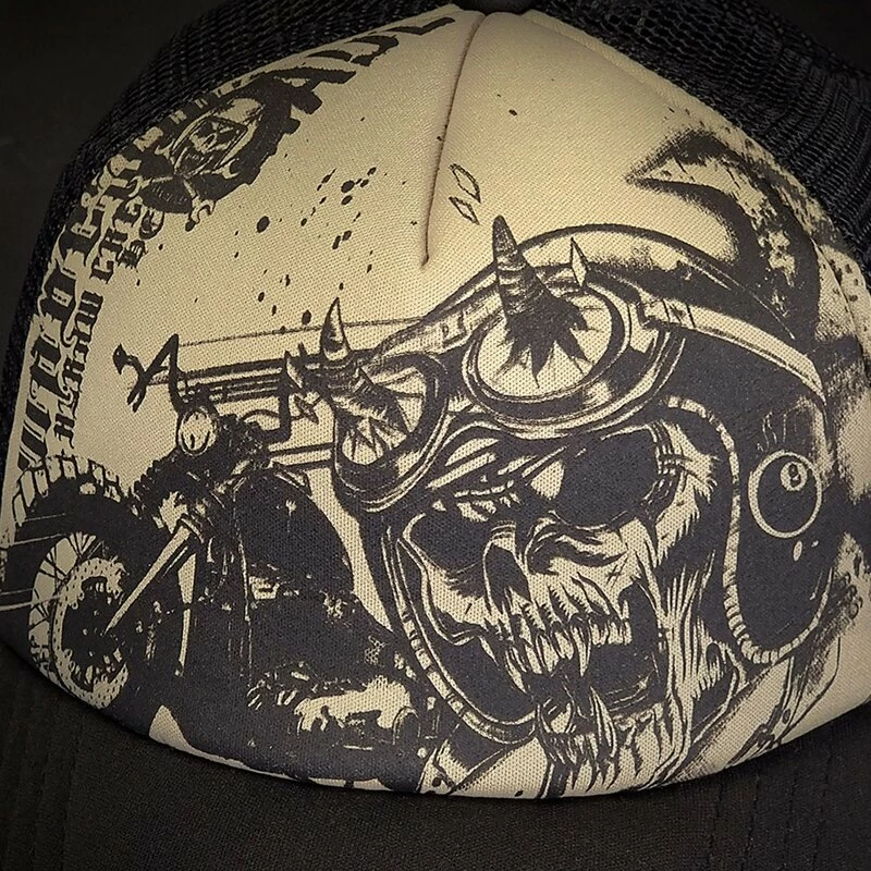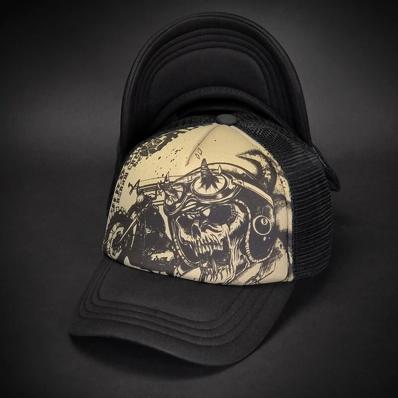 Coole Snapback Trucker Kappe von Hyraw. Die 666 Road Cap hat einen Print mit einem monströsen Skelettbikers vor seiner Maschine.