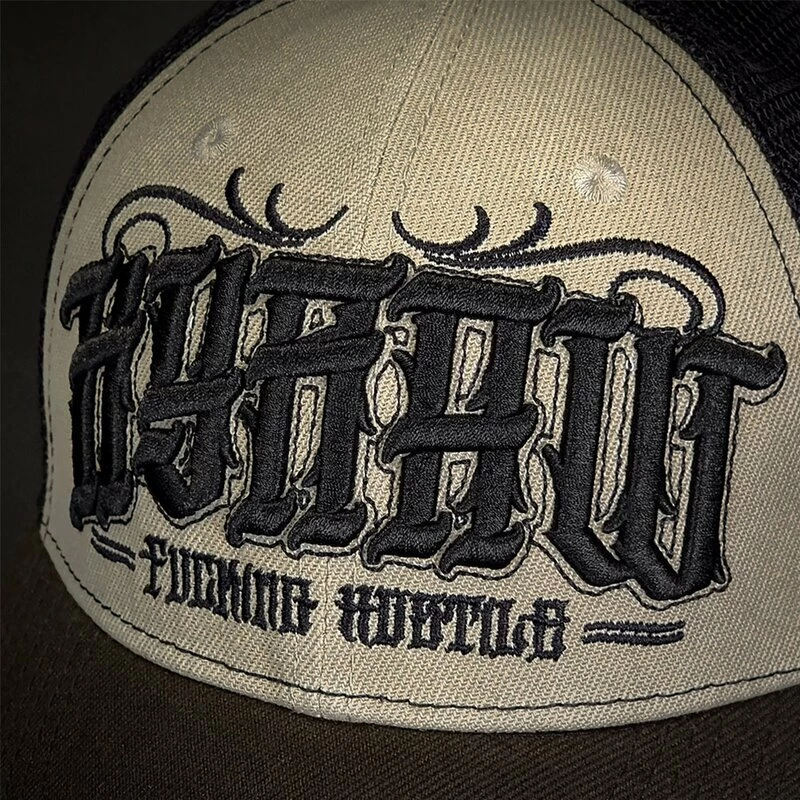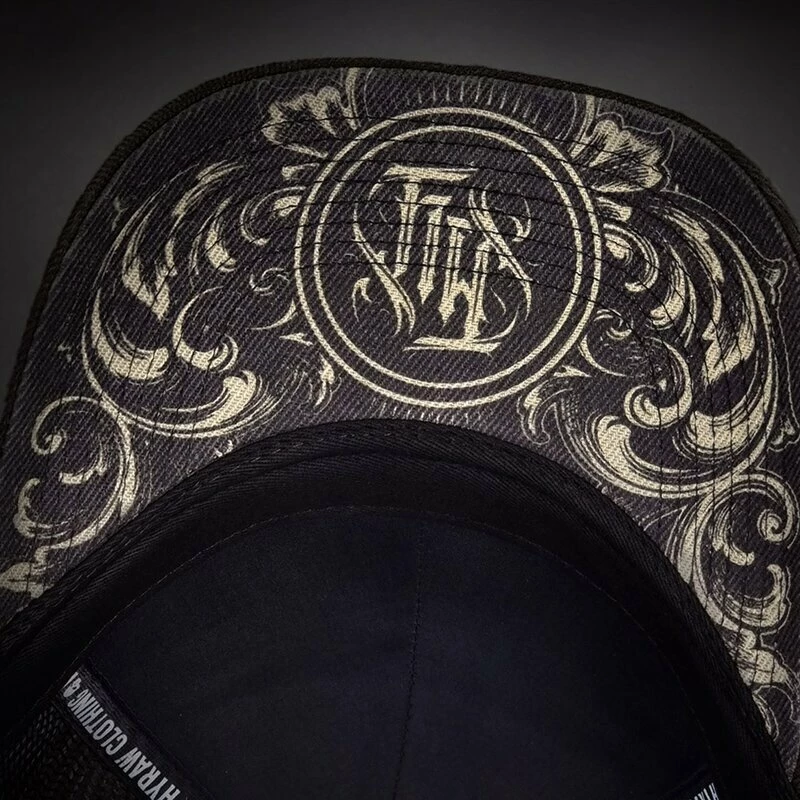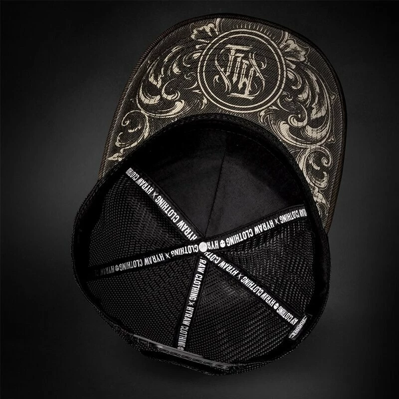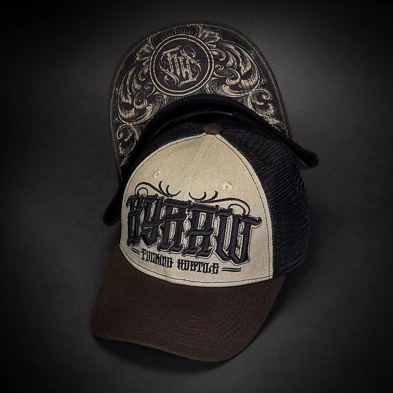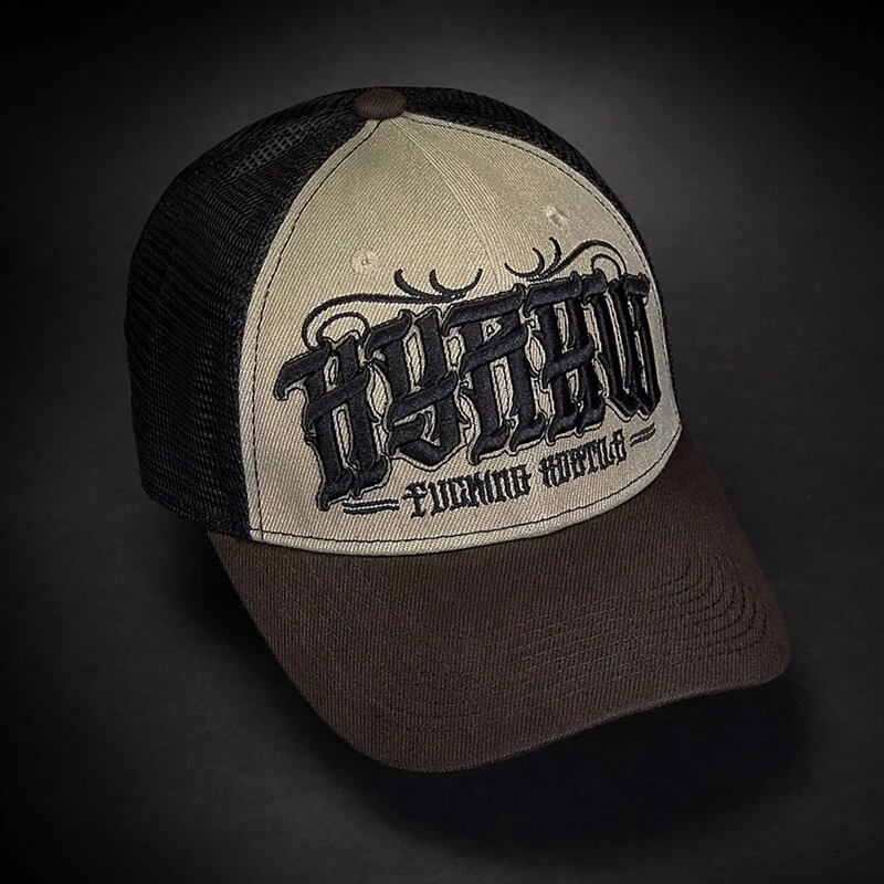 Coole Snapback Trucker Kappe von Hyraw. Die Basic Brown Cap hat einen 3D bestickten Hyraw Schriftzug an der Vorderseite. An der Unterseite des Schirms befindet sich ein vintage Print mit Wappen Logo.