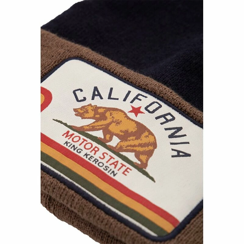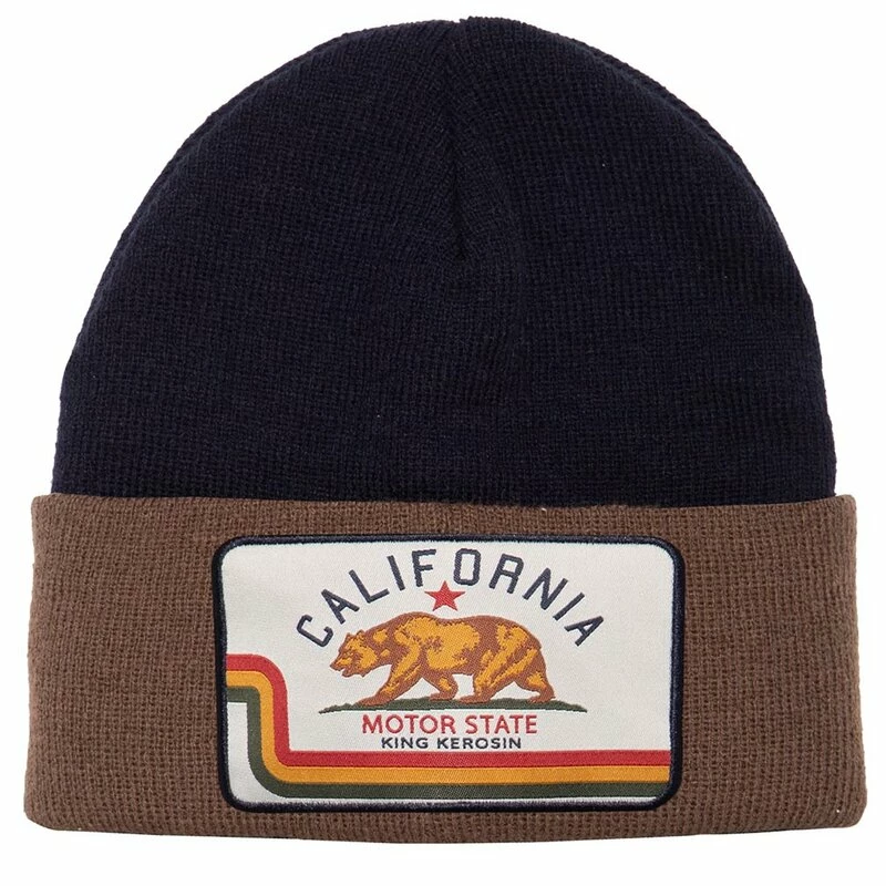 Weiche Wintermütze mit Vintage Flair von King Kerosin. Die California Mütze hat ein besticktes Patch mit Grizzly Bär an der Vorderseite.
