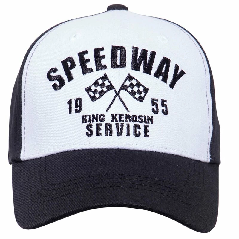 Rockabilly Flex Kappe von Vintage Topmarke King Kerosin. Die Speedway Cap hat eine “Speedway” Stickerei mit zwei überkreuzten Rennflaggen an der Vorderseite
