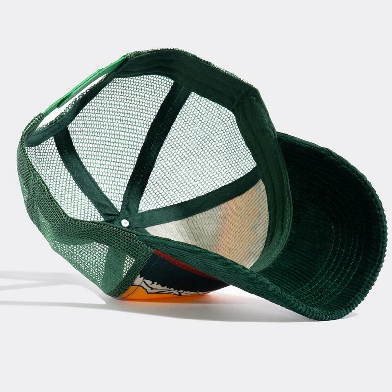 Rockabilly Trucker Kappe von Vintage Topmarke King Kerosin. Die California Green Kappe hat einen Schirm aus Cord, mit einem retro California Print.