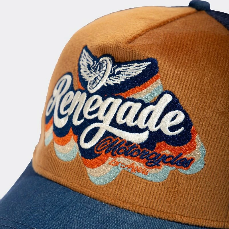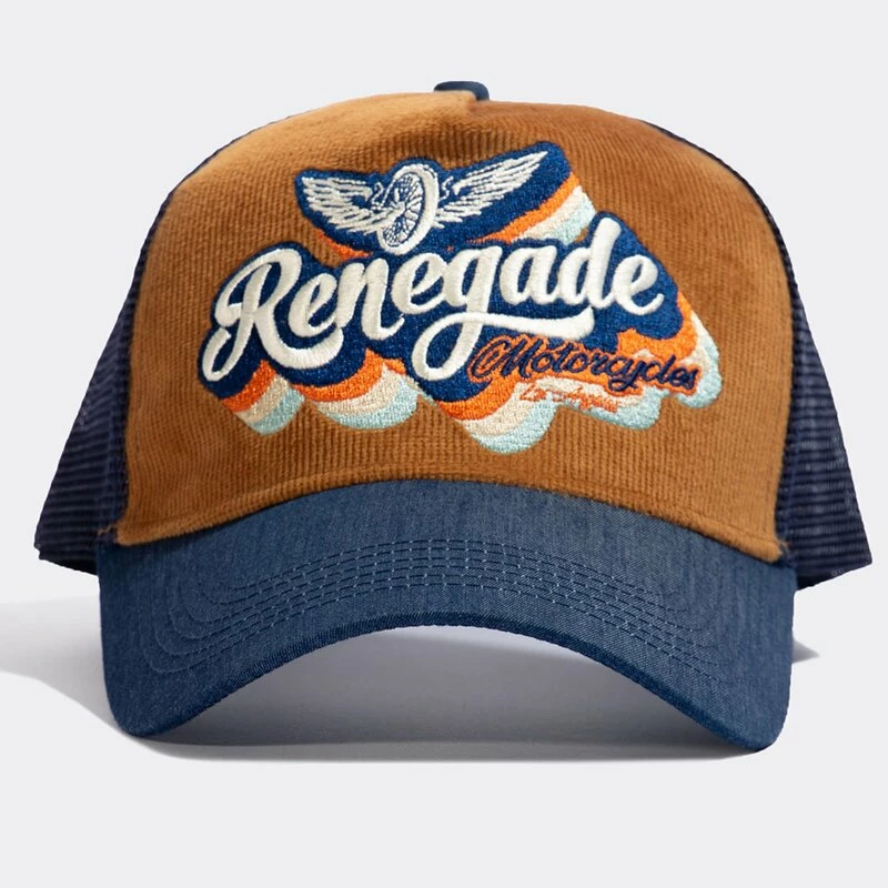 Rockabilly Trucker Kappe von Vintage Topmarke King Kerosin. Die Renegade Kappe hat eine Front aus Cord, mit einer retro 70er-Jahre Renegade Stickerei.