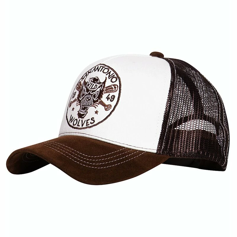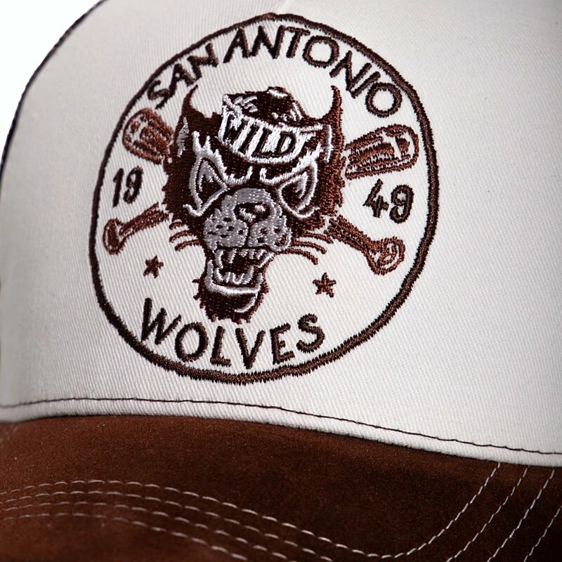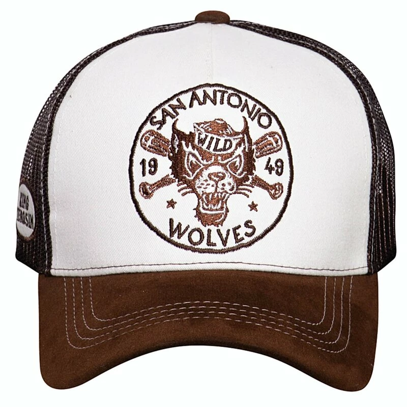 Rockabilly Trucker Kappe von Vintage Topmarke King Kerosin. Die San Antonio Wolves Kappe hat ein besticktes Wolf Logo an der Vorderseite.