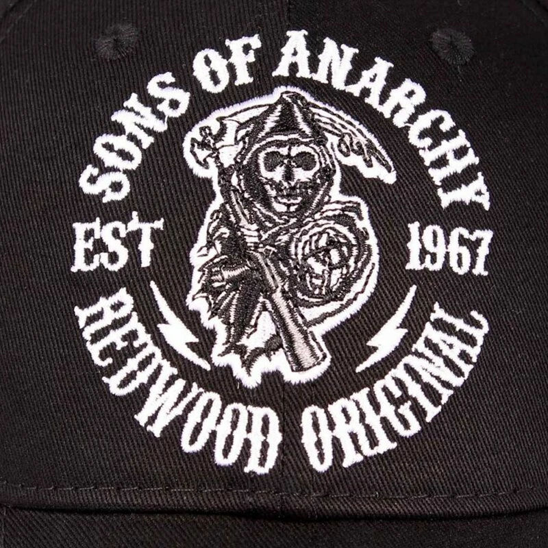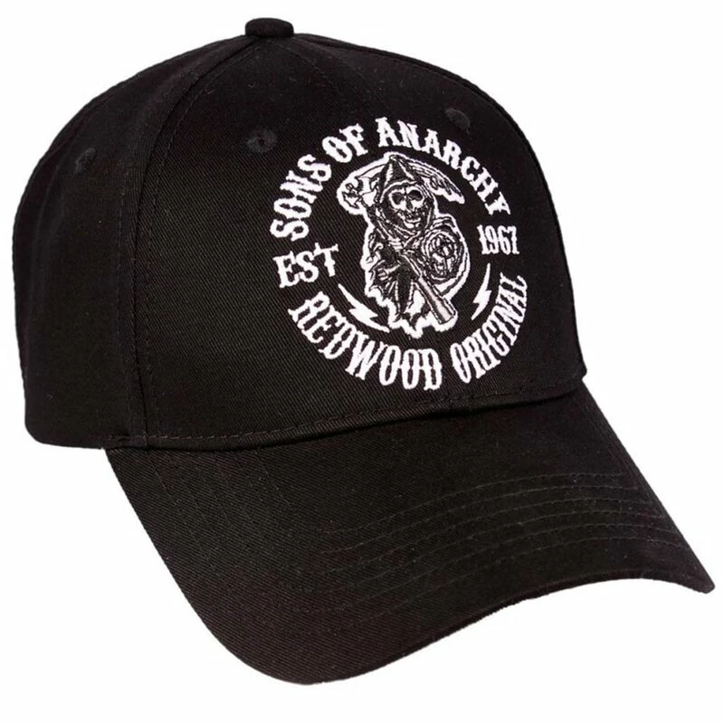 Coole Kappe für Fans der Kultserie Sons of Anarchy. Die SOA Logo Mütze hat ein besticktes Reaper Logo mit “Redwood Original” Schriftzug an der Vorderseite. Auf der Rückseite ist eine Anarchy Logo bestickt.