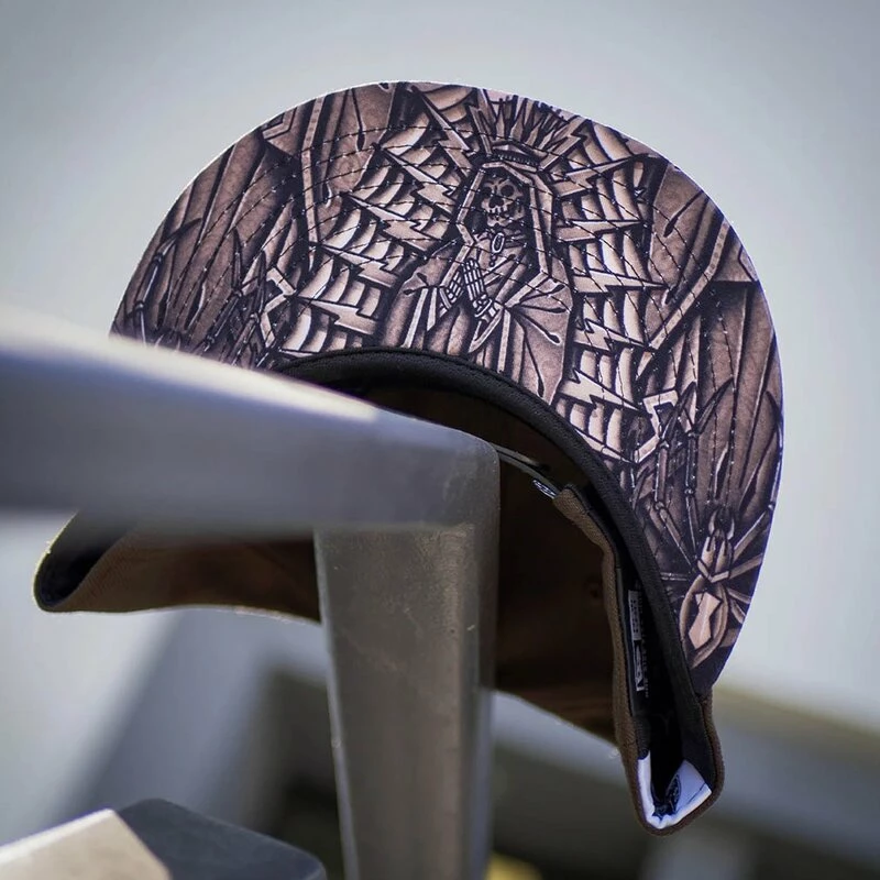 Coole Snapback Kappe von Sullen Clothing und New Era. Die HRSPANKS Mütze hat eine Sullen Schriftzug Stickerei an der Vorderseite. Der Schirm hat an der Unterseite einen Print einer skelettalen heiligen Madonna. Eine Illustration des Künstlers Hunter Spanks.