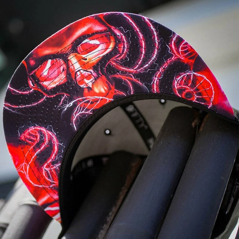 Coole Snapback Kappe von Sullen Clothing und New Era. Die Sarvo Mütze hat eine Sullen Schriftzug Stickerei an der Vorderseite. Der Schirm hat an der Unterseite einen Print eines Schädels umgeben von elektrisierten Tentakeln.