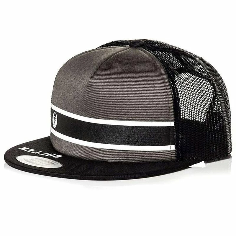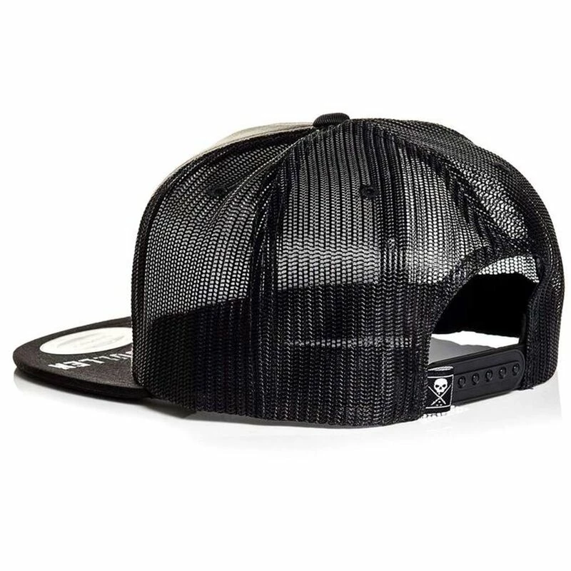 Snapback Trucker Kappe für alle Tätowierer und Tattoo-Freaks. Die Atlantis Kappe hat eine graue Vorderseite mit Kontraststreifen in schwarz und weiß an der Vorderseite. Ein kleiner Sullen Schriftzug befindet sich auf dem Schirm.