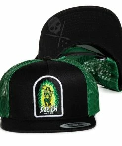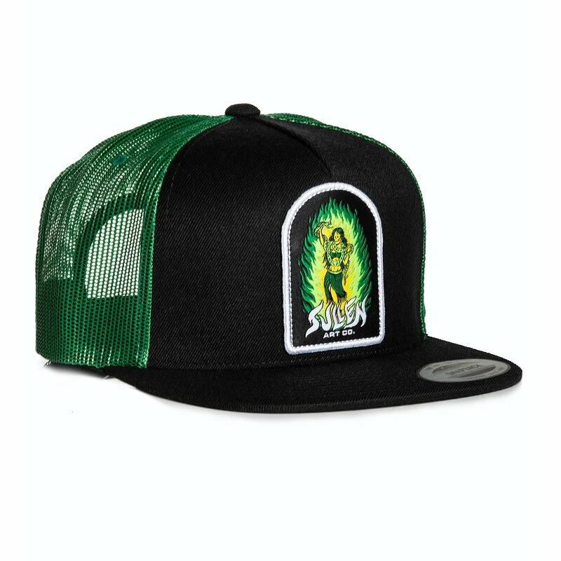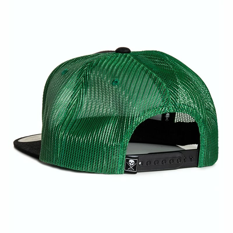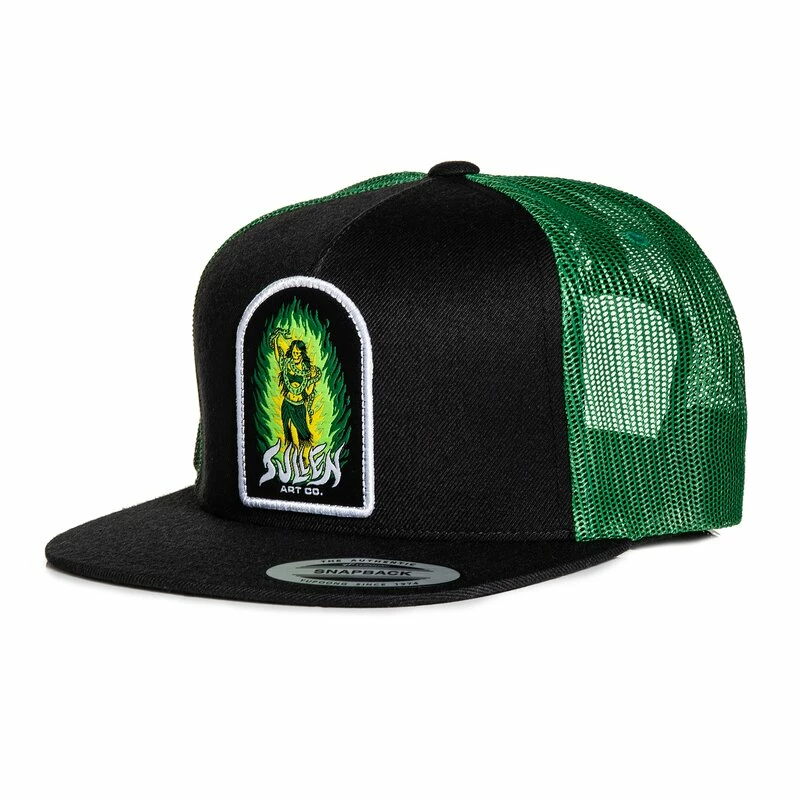 Trucker Kappe von Sullen Art Collective. Die Charmer Mütze hat einen SAC Patch mit Skelett Schlangenbeschwörerin an der Vorderseite, und ein Logo Print auf der Unterseite des Schirms.