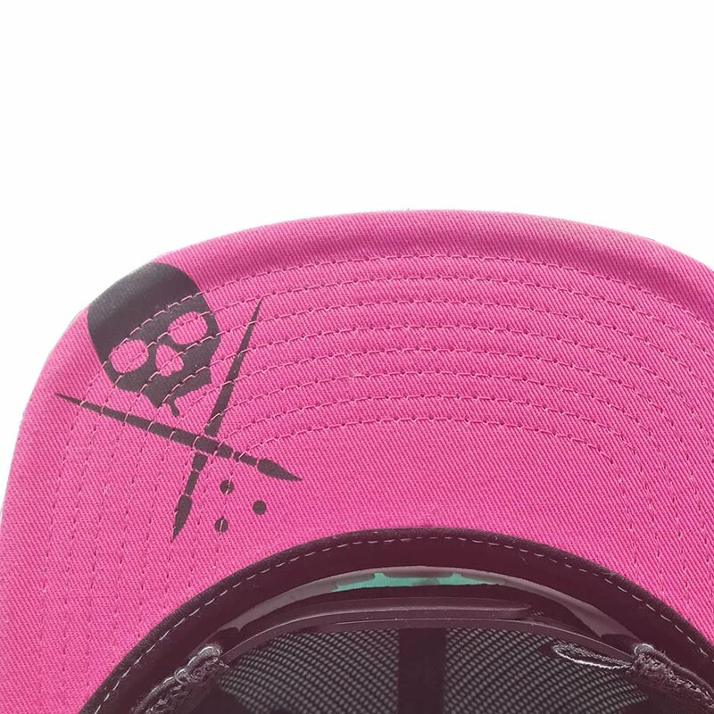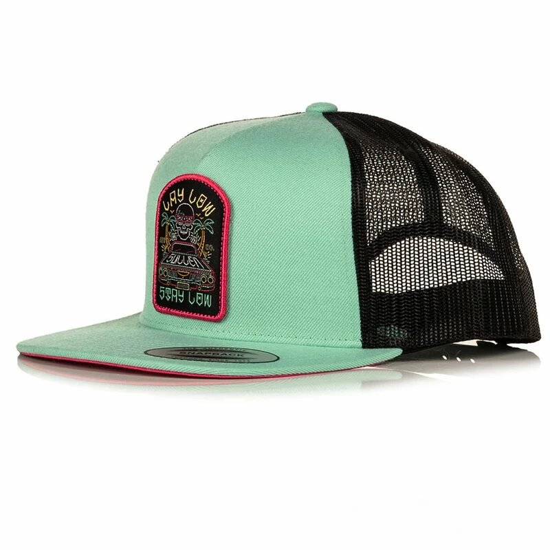 Mesh Trucker Kappe von Sullen Art Collective. Die Lay Low Mütze ist neonfarben mit einem Muscle Car Schädel Patch an der Vorderseite, und einem SAC Logo an der Unterseite des Schirms.